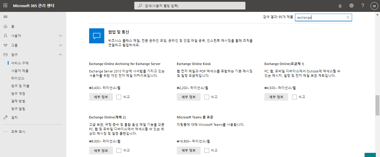 1. M365 관리센터 > 청구 > 서비스 구매 > exchange 검색