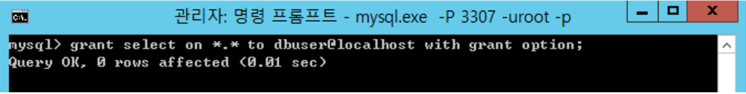 - Dbuser 사용자에게 모든 DB, 모든 TB 에 select 권한 부여